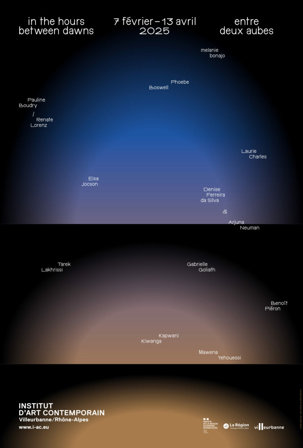 Balade tantôt rêvée ou fantasmée, in the hours between dawns(1) convoque des pratiques qui interrogent, dénouent et transforment les structures de pouvoir et les récits hégémoniques tout en imaginant des futurs sensibles et multiples. Elle présente les œuvres de onze artistes ou duos d’artistes comme autant de poèmes desquels émergent de possibles horizons. Expression par le corps, par l’écriture de nouvelles narrations, par l’hommage ou même par la caresse, ielles ouvrent la voie à la lumière tapie dans les zones les plus sombres. Éclats dans l’obscurité, les familles – choisies ou non – , les communautés et les héritages deviennent des ressources essentielles à la (re)construction du soi et du commun : à la fois refuge et forme d’idéal, espace d’écoute, d’appartenances, d’affects et de transformations. Se tisse ainsi une archive poétique et fragmentée au sein de laquelle le collectif et l’individuel, le réel et le spéculatif se rencontrent.