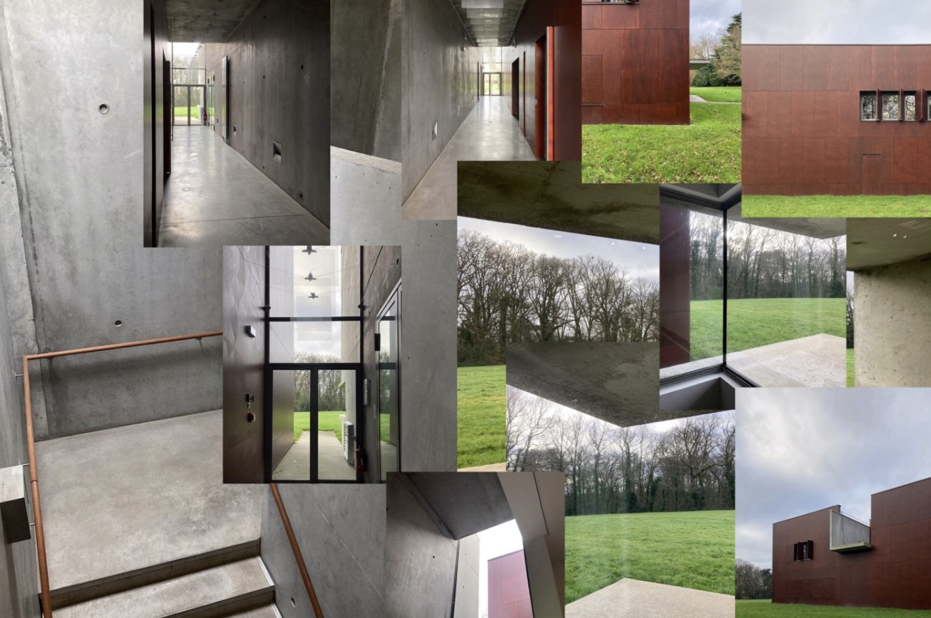De loin, le bâtiment du Frac est une boîte en bois posée sur l’herbe. Au dedans, le béton s’étire jusqu’au plafond. À travers la fenêtre, le paysage remplit tout l’espace.